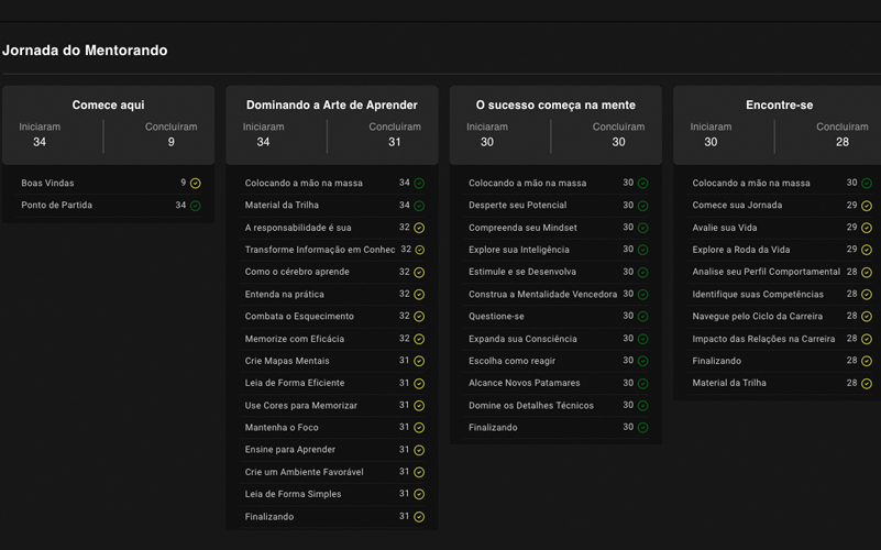 Na Mentorfy, você pode desenvolver um processo de mentoria com uma arquitetura modular, permitindo que crie seu próprio caminho de aprendizado de forma simplificada e sem estresse.